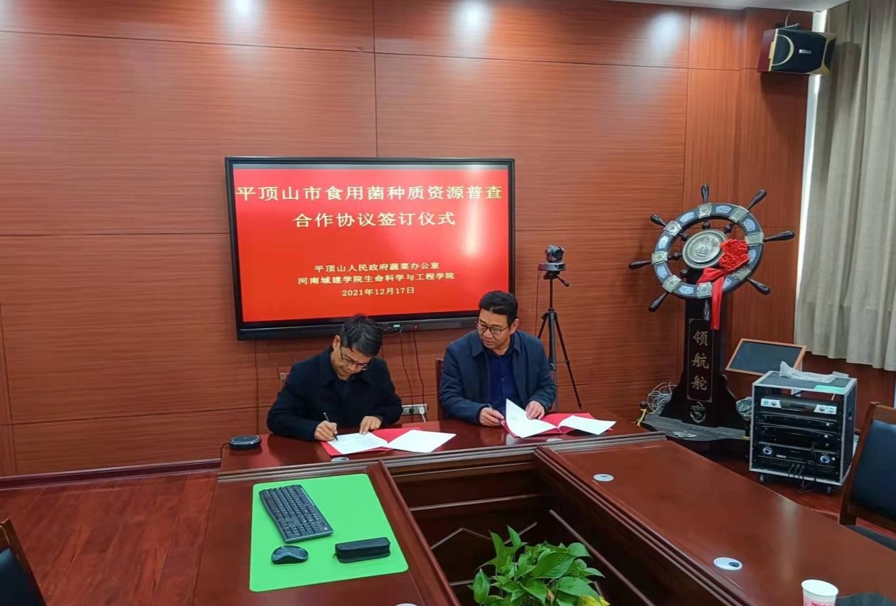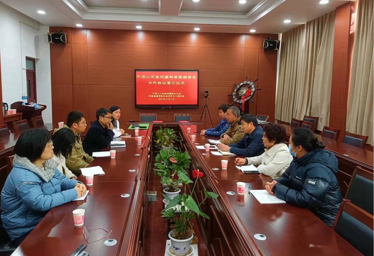 为高质量完成平顶市食用菌种质资源普查工作,充分发挥高校人才优势,加强政校合作,12月17日上午平顶山市人民政府蔬菜办公室与beat365官方登录beat365官方登录,在该院会议室举行了平顶山市食用菌种质资源普查合作签约仪式。仪式上,市蔬菜办主任程国强对食用菌种质资源普查工作的意义与重要性作了详细说明,并对普查工作提出了具体、明确的要求。beat365官方登录副经理谢朝晖对市蔬菜办领导的信任与支持表示感谢,他简要介绍了食用菌种质资源普查团队的人员和工作计划,并强调beat365官方登录将高标准、严要求,全力以赴做好平顶山市的食用菌种质资源普查工作。