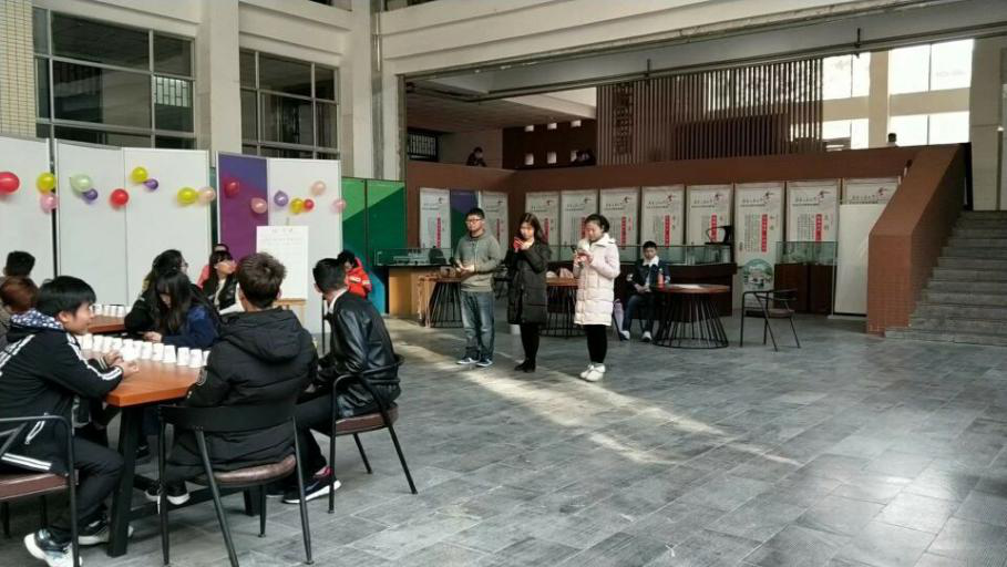 活动开始前,心理协会成员布置场地,准备道具,心理委员从个班抽取4―5人参与活动。第一个活动是唱歌接龙,同学们各自发挥,气氛热烈。第二场游戏是纸杯风暴,包括气球吹纸杯,纸杯搭收,各位同学互相配合,分工明确。还有你画我猜,夹气球,蒙眼贴鼻,速决纸杯,同学们在热烈的活动中展现自我,互相交流合作。最后一个游戏是迷途知返,每组成员集体活动互相配合,共同完成任务。最后,同学们在卡片上写下对校内任意一位同学想说的话,并留下联系方式和信息,心理协会干事将于元旦夜发送小礼物。