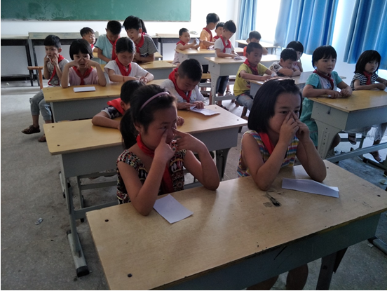(图为支教团带领孩子们做眼保健操)