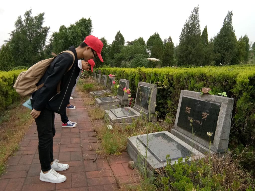 上午9点,志愿者们到达烈士陵园。进入陵园后,大家在烈士事迹陈列馆里进行了参观,了解了鹰城人的革命历史。参观结束后,志愿者们在馆外的葛汉斌、吴志国两位烈士的雕像前敬礼。然后,志愿者们进入陵园深处,在革命烈士墓碑前鞠躬,并且将周围的杂草去除,擦去石碑上的积灰,放上鲜艳的花朵。