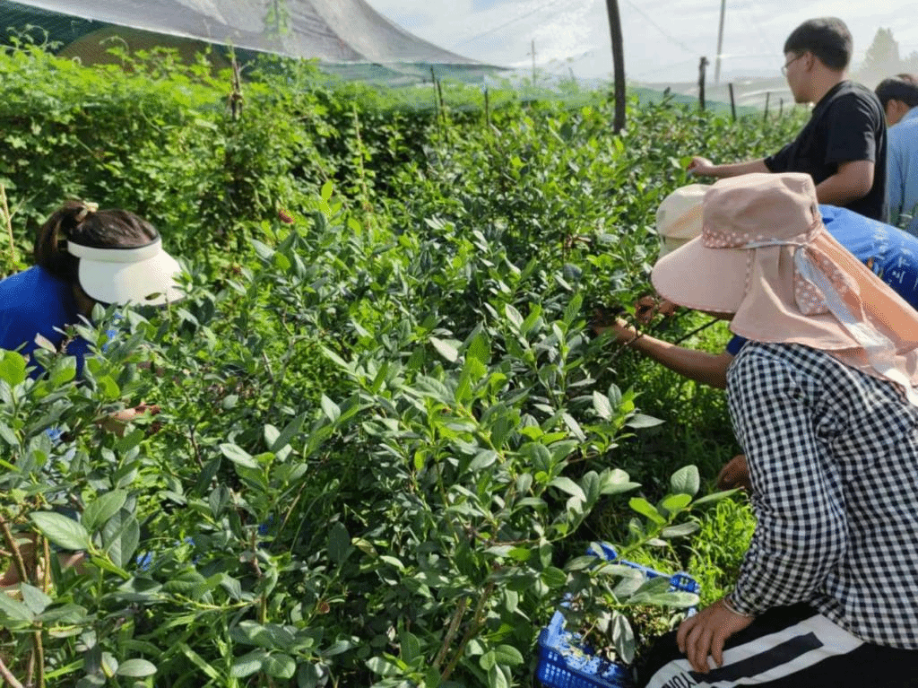 团队成员帮种植户采摘蓝莓
