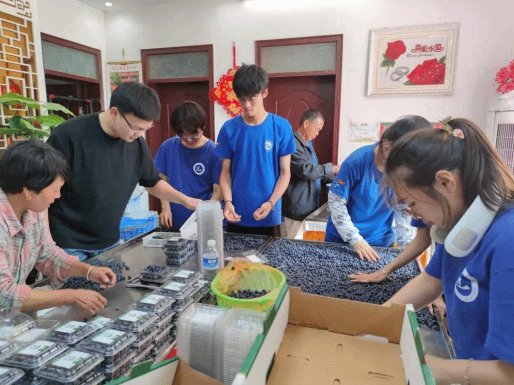 实践团成员去当地蓝莓种植户家里一起参与分拣蓝莓