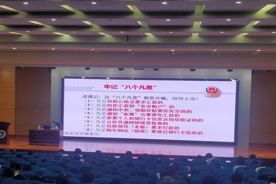 韩璐围绕“什么是电信诈骗、电信诈骗的形势与种类、与校园相关的电信诈骗、电信诈骗防范常识”等六个方面,以鲜活的案例,向师生们详细讲解了当前校园中常见的电信网络诈骗类型和电信网络诈骗的危害、特点、作案手法及防范方法。同时提醒全体师生要牢记“八个凡是”,做到“四要四不要”,切实提高电信网络诈骗防范技能,守住全体师生的“钱袋子”。
