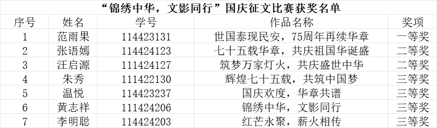 此次活动,同学们表现出了极大的文学创作热情,他们在纸上执笔生花,一展爱国热情。一句句深情的话语,一段段激昂的文字,汇集了同学们对祖国的热爱与赞美。他们有的回顾祖国的辉煌历史,感慨万千;有的描绘祖国的壮丽山河,如诗如画;还有的讲述身边的爱国故事,感人至深。一篇篇优秀的征文作品,展现了新时代青年的家国情怀和责任担当。最后,经过认真评选,范雨果等七名同学分别获得一、二、三等奖。