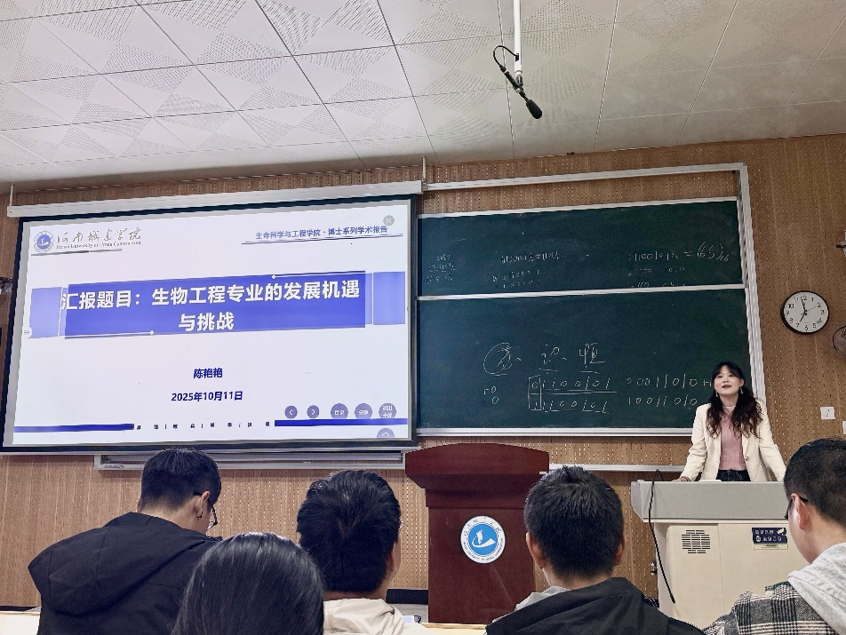 (通讯员 马凤莲)为帮助2025级新生深化学科认知、科学规划学业,beat365官方登录持续推进“博士讲坛”系列学术活动。10月11日晚,第三期讲座在6号楼C116教室顺利举行,生物工程系陈艳艳博士为2025级全体生物工程专业新生作了题为《生物工程专业的发展机遇与挑战》的专题报告。