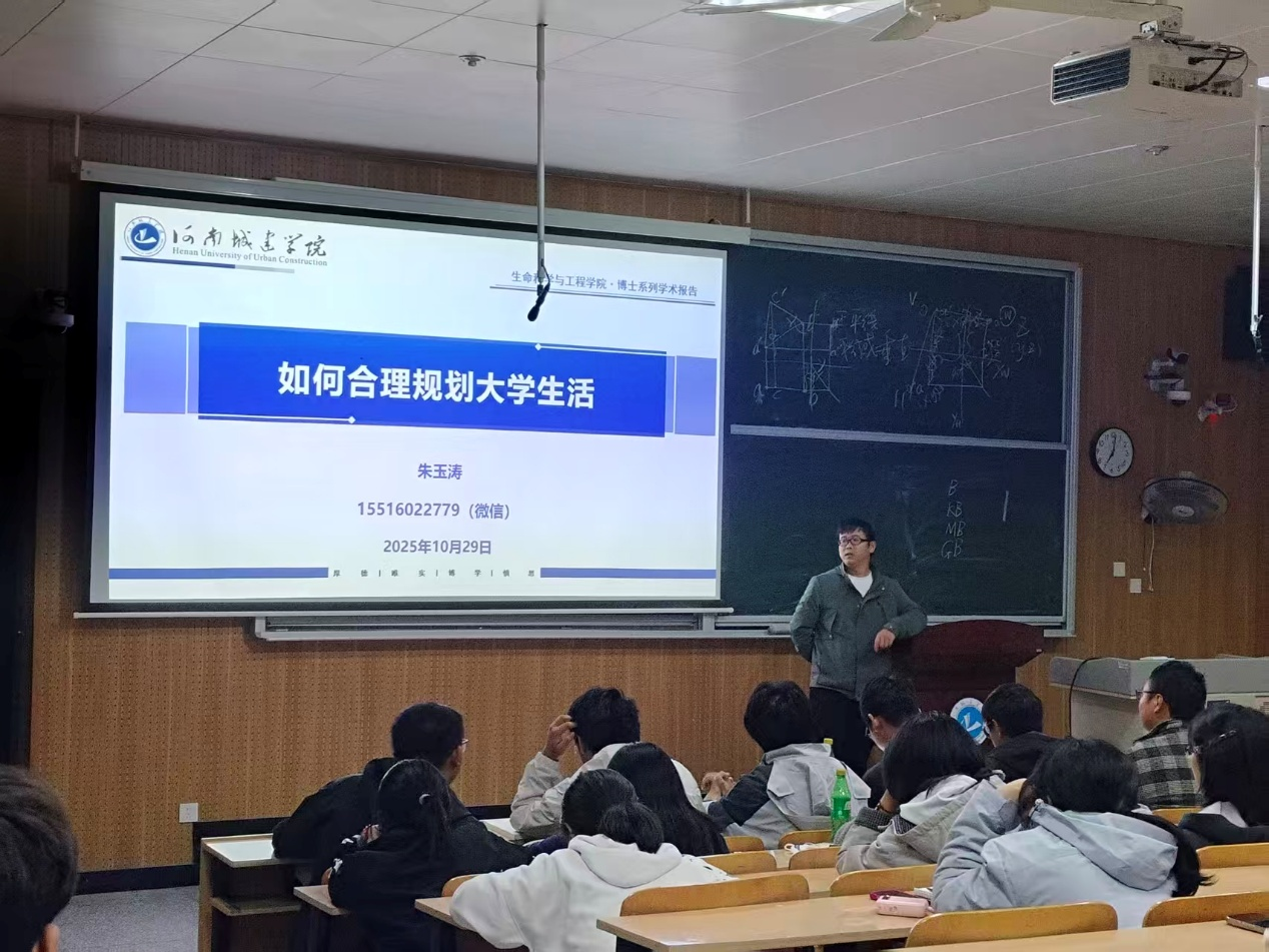(通讯员 朱玉涛)为帮助2025级生物工程专业新生合理规划老员工活,10月29日晚,beat365官方登录“博士讲坛”第十期在6号楼C116教室顺利举行。朱玉涛博士以《展望未来:如何合理规划老员工活》为题,为生物工程专业全体新生带来一场高屋建瓴又细致入微的生涯规划指导专题讲座。