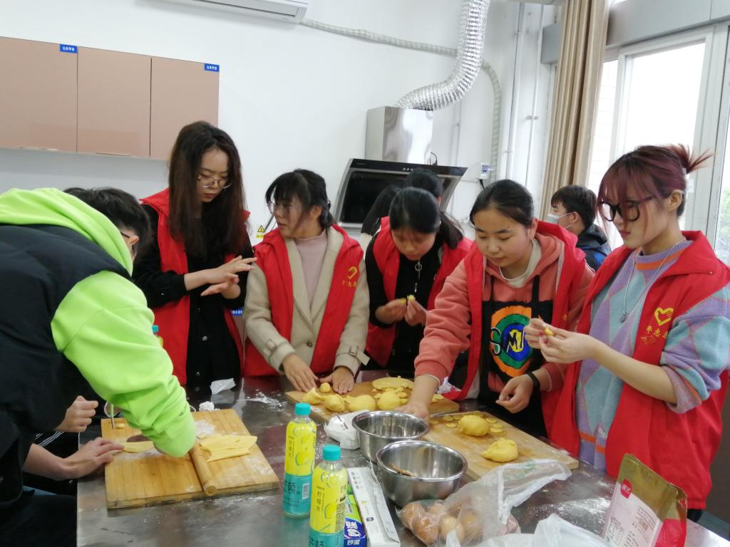 活动现场,由活动负责人现场讲解并指导志愿者制作饼干。制作过程中,志愿者们分工合作,有的融化黄油,有的打发蛋清,有的和面。志愿者们努力克服缺少烘焙工具等问题,认真学习如何制作饼干。在饼干做好后,志愿者们将做好的饼干进行分装,向过路的同学们进行分发。