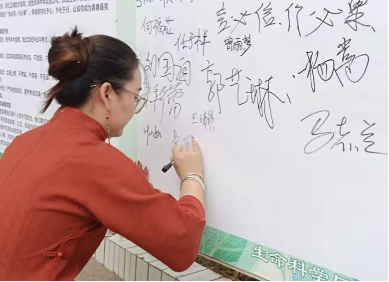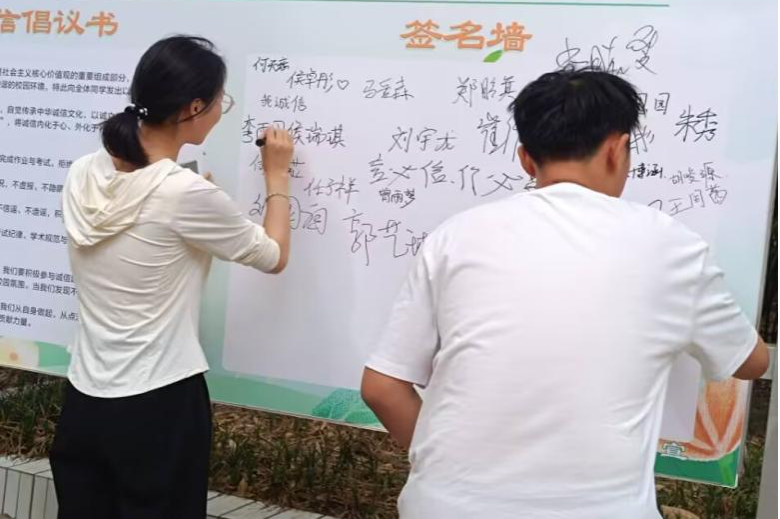 活动现场设有主题签名墙及诚信倡议书,,从"树立诚信观念"、"践行诚信行为"、"共筑诚信校园"三个方面号召员工恪守学术规范、如实申报资助、文明上网、遵规守纪活动吸引了员工们积极参与,大家在签名墙上写下“言必信,行必果”、“诚信立身”等诚信箴言,并郑重承诺,表示将从考试纪律、学术规范等细节践行诚信准则。